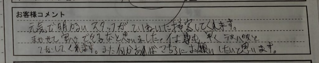 「元気で明るいスタッフがていねいに接客してくれます。まかせて安心できるなと思いました。仕事も早くテキパキとこなしてくれます。また何かあればこちらにお願いしたいと思います。」
