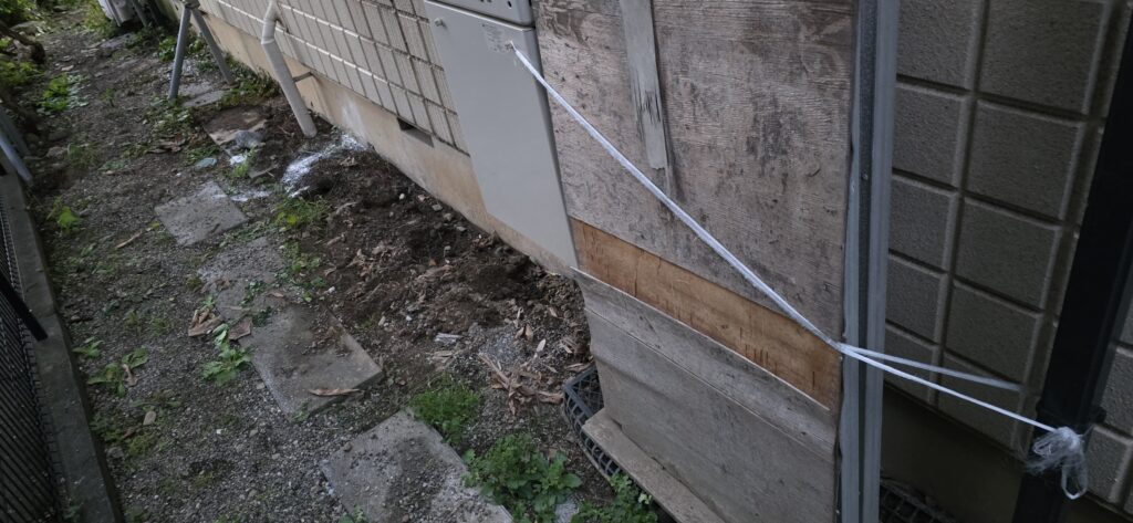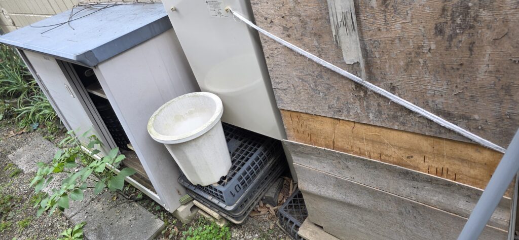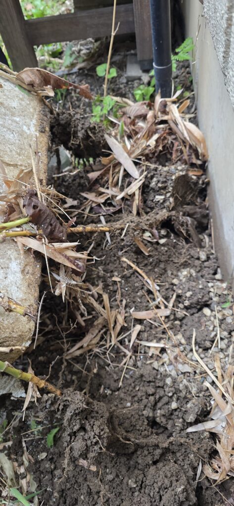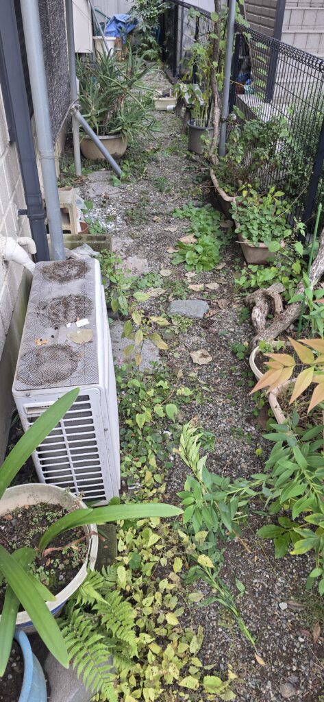 家周りの庭雑草や伐採途中の枝木、落ち葉、