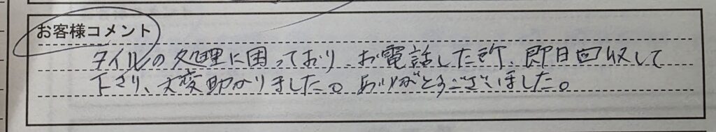 「タイルの処理に困っておりお電話したところ、即日回収してくださいり大変助かりました。ありがとうございました。」
