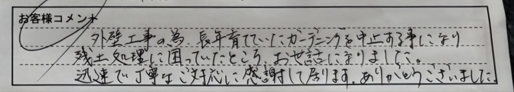 「外壁工事の為、長年育てていたガーデニングを中止する事になり残土処理に困っていたところ、お世話になりました。迅速で丁寧なご対応に感謝して居ります。ありがとうございました。」